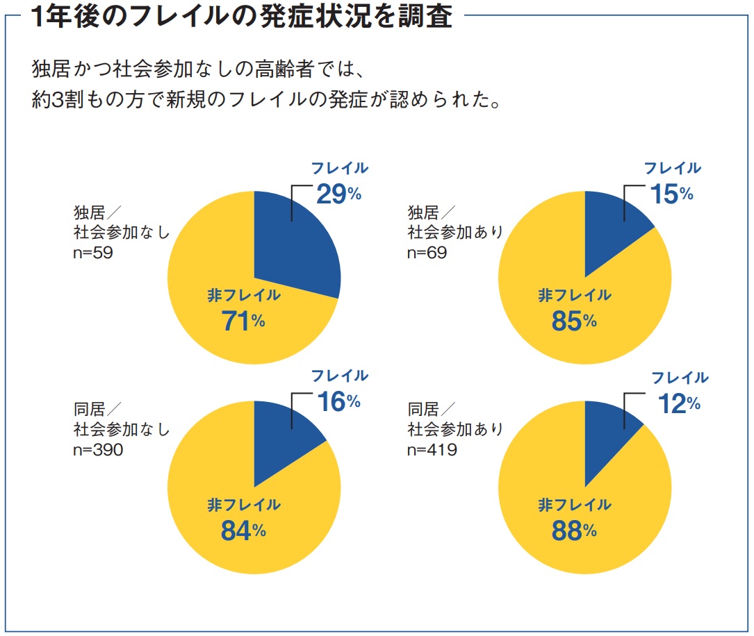 「社会的フレイル」とは、「一人暮らし」「近隣との付き合いがない」「サークルやボランティア、就労など、活動の場に参加していない」高齢者を指す。