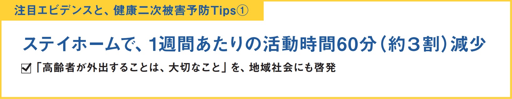 まず、山田さんが、高齢者の健康二次被害として最も注意を喚起するのは、ステイホームにより、身体活動が減少したことと、外出する機会を失ってしまったことだ。